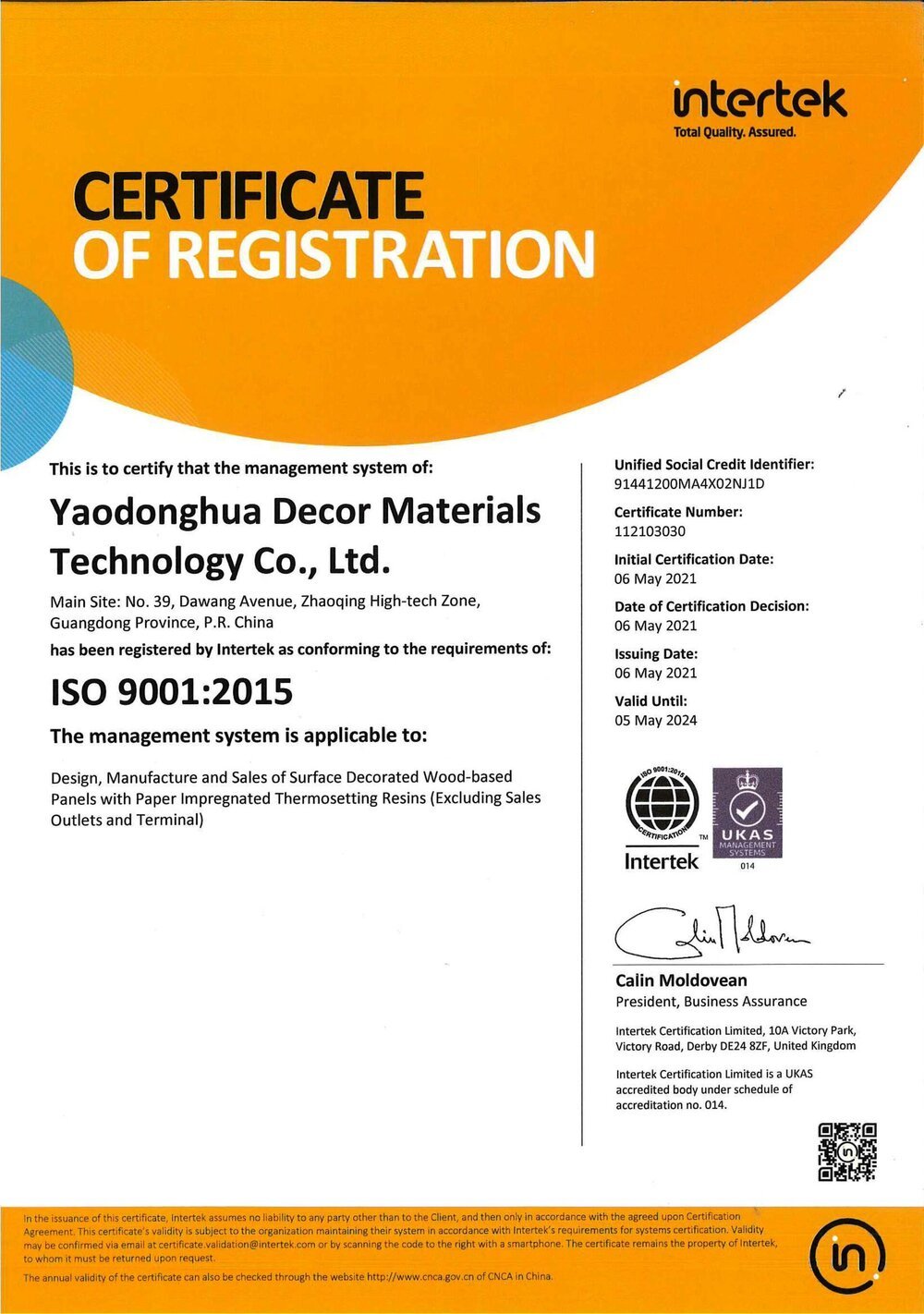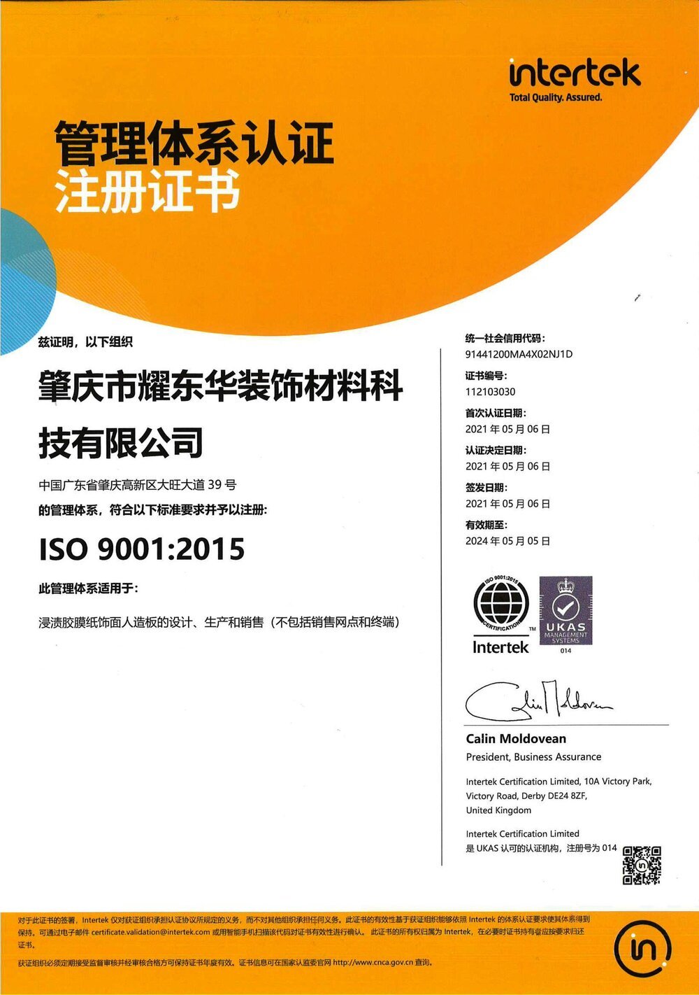 肇庆市米兰官方端网页版ISO90012015-证书-英文版